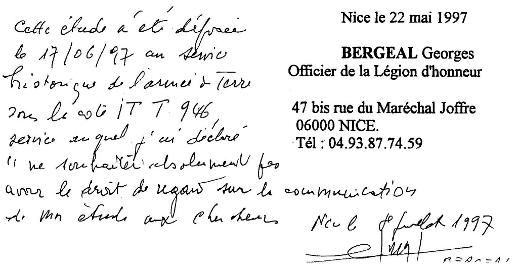 finalisée en 1997, a été déposée aux Service Historique de l'Armée de Terre à Vincennes. Un exemplaire a été remis au Président de la République de l'époque.